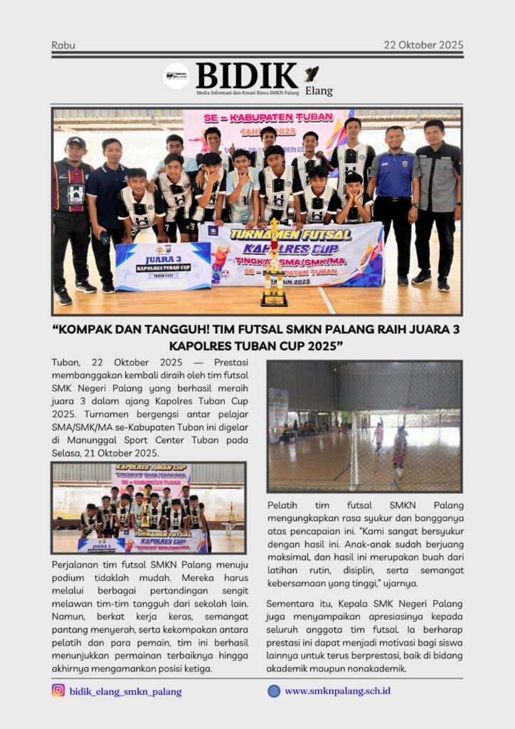 Kompak dan Tangguh! Tim Futsal SMKN Palang Raih Juara 3 Kapolres Tuban Cup 2025″ Oktober 22, 2025November 12, 2025