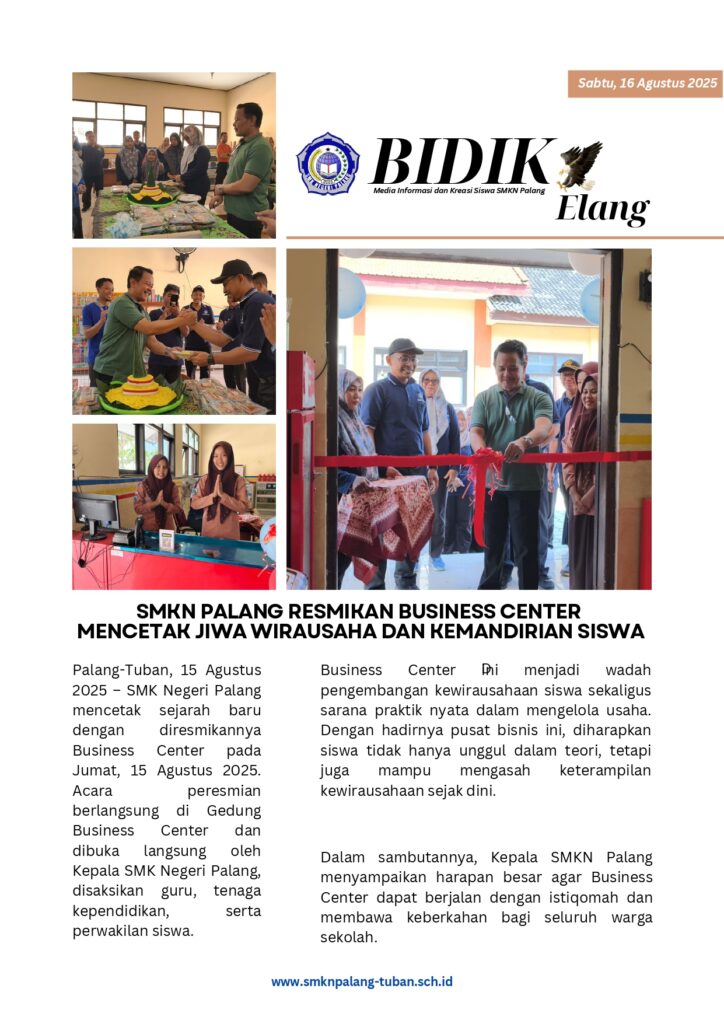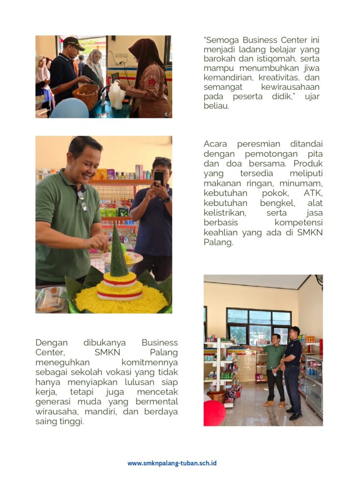 Palang-Tuban, 15 Agustus 2025 – SMK Negeri Palang mencetak sejarah baru dengan diresmikannya Business Center pada Jumat, 15 Agustus 2025. Acara peresmian berlangsung di Gedung Business Center dan dibuka langsung oleh Kepala SMK Negeri Palang, disaksikan guru, tenaga kependidikan, serta perwakilan siswa.