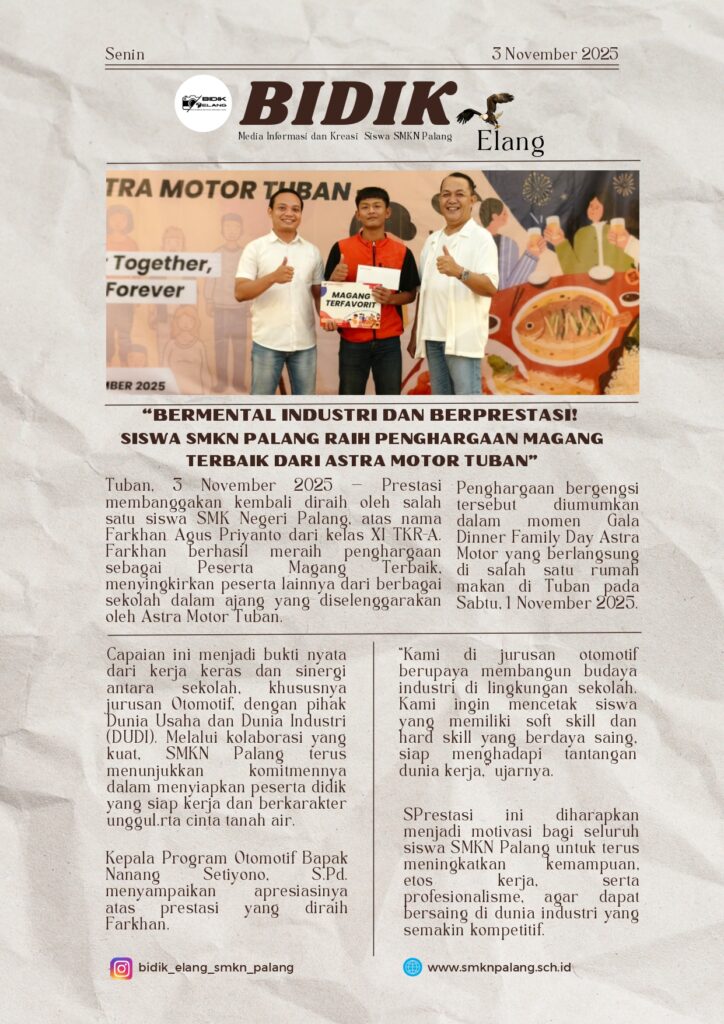 Bermental Industri dan Berprestasi! Siswa SMKN Palang Raih Penghargaan Magang Terbaik Dari ASTRA Motor Tuban.